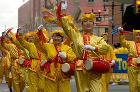 法轮大法的队伍是第一个出场的团体,参加的人数最多,也是唯一一支以华人为主的受邀团体,共有四个表演内容:上百人编制的欧洲天国乐团、扇子舞、法轮功功法表演和唐装表演。队伍气势宏大,色彩绚丽。