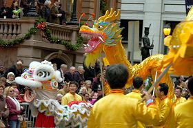 ![]() 舞龙舞狮吸引着两旁的观众 |