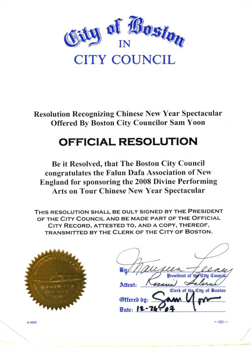此褒奖由市议会主席共同签署并作为波士顿市官方文件,并