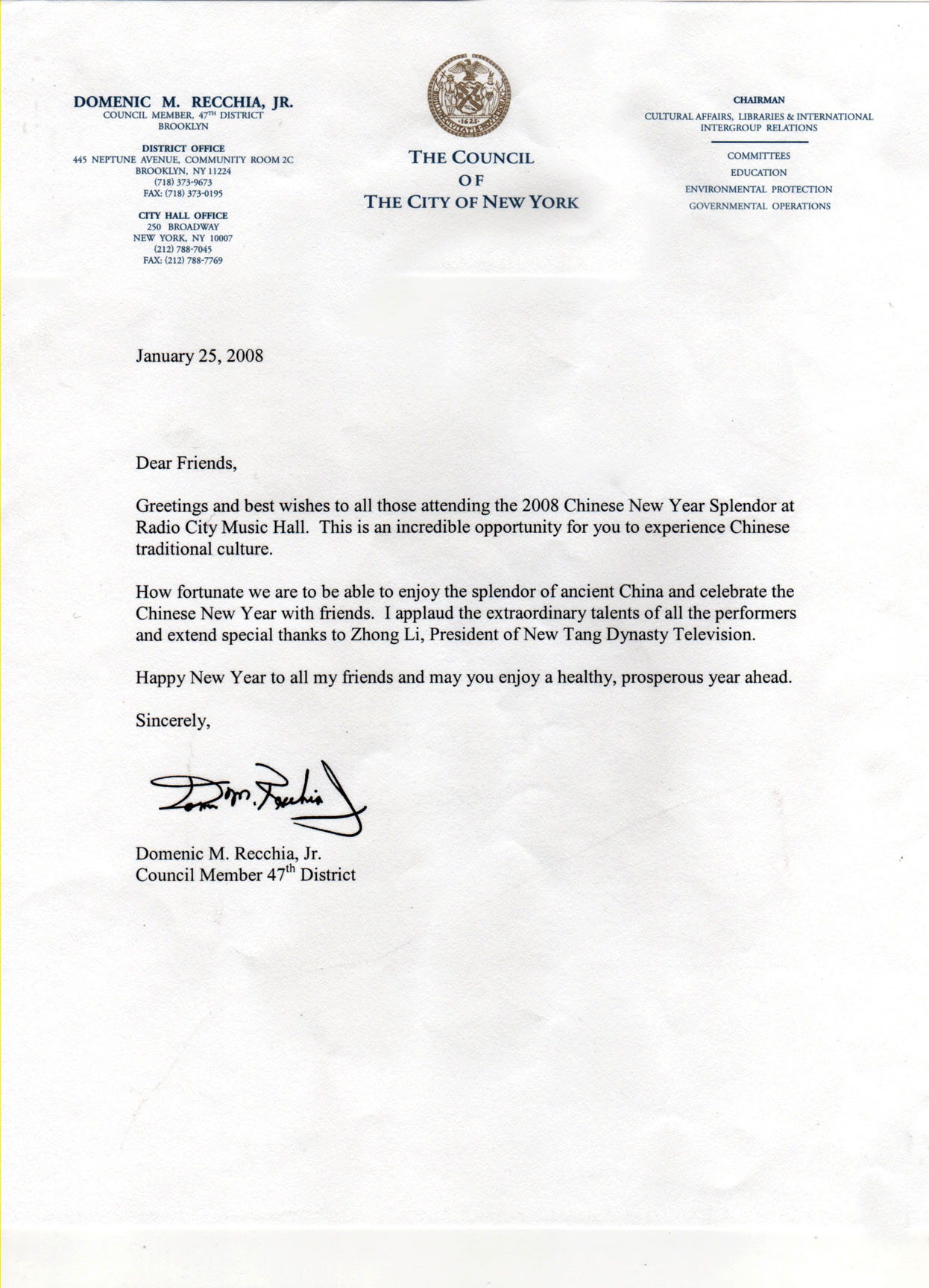Domenic在信中向所有参加二零零八年在无线电城音乐厅观看华人新年晚会的观众们致以最良好的祝愿。他说:“这是你们了解中华传统文化的难得的机会。”