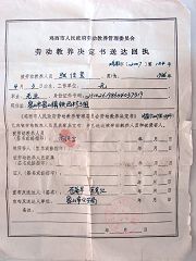 为了骗取被害人家属在投劳教决定通知书上签字,看守所警察林永峰把应该在公安局把人投到劳教所接收后签完字拿回来存入档案的回执单拿给被害人家属,逼其签字,被害人家属为了拿到公安局的犯罪证据,就签了字,同时收下了这份罪证,马上走了,当走出100多米后,林永峰急忙给法制科的李文良打电话,让其赶快要回回执单,说是给错了。其实被害人家属早已识破了他们的诡计,此时是10月15日上午9点30分左右。
