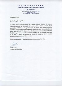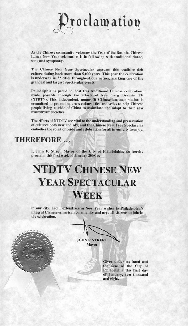 宾州副州长办公室助理安尼•卡尔(Annie Karl)带来了副州长的贺信。费城市国际贸易和外交部经理(Manager of International Trade and Diplomatic Liaison for the City of Philadelphia)凯若•布鲁克斯(Carol Brooks)代表费城市长约翰•史萃特(John Street)前来参加宴会。市长宣布二零零八年一月的第一个星期为费城“新唐人电视全球华人新年晚会周”。
