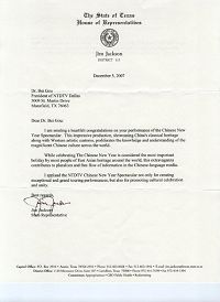 特拉华州最大城市威明顿的市议会主席(President of City Council of Wilmington, Delaware)Ted Blunt先生兴奋的说:“有好几个节目我都很喜欢。我特喜欢打鼓的那个节目,简直太棒了!扇子舞(‘清韵’)非常独特。我还非常喜欢‘顶碗舞’。”Blunt先生表示:“非常高兴能有机会观赏另一种习俗、另一种文化,欣赏另一个民族的人。”他说晚会把他带到了一个他不曾熟悉的历史时期,使他能有这种不同寻常的感受。