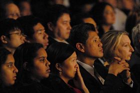 KIM还说:“这个晚会很独特,我以前从没看到过这样的、由中国人主办的晚会。这可能是我见过的包容最多文化的演出了(This is probably the most multi-cultural show that I’ve been to in my life time.)。我觉的晚会非常精彩,我真是很陶醉(I am really enjoying myself.)。”