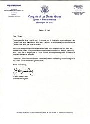 ![]() 美国国会议员肯尼.马辰特给全球华人新年晚会的贺信 |