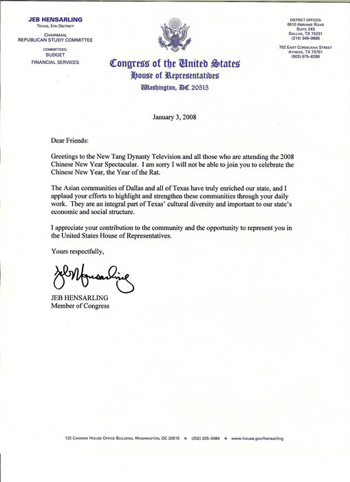 ![]() 美国国会议员杰博.贺森凌(Jeb Hensarling)的贺信 |
