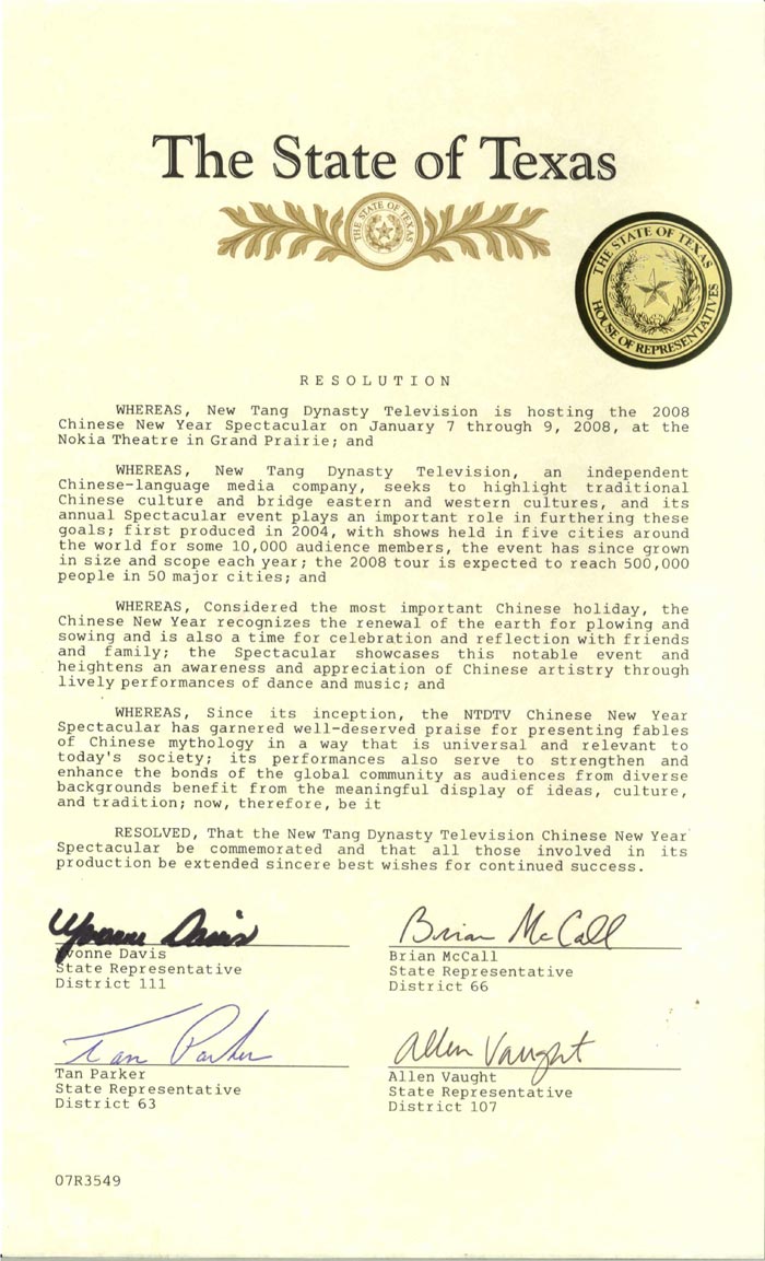 【明慧网二零零八年一月七日】(明慧记者曾洪达拉斯报道)二零零八年一月五日,美国德克萨斯州众议院通过决议案,支持新唐人全球华人新年晚会在达拉斯地区的演出;赞许新唐人电视台通过全球华人新年晚会的方式表现中国的神话传说;并认为晚会使不同背景的观众都能够受益,增强了全世界的联系。