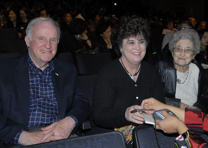 她的先生(Dennis Reeder )是美国人,他情不止禁接着说:“我有一个总结,整台节目所展现的是‘真、善、忍’。”他还说:“这些节目都有中英文,我们能看懂,三位男演员唱的太棒了。”这对夫妻表示:非常高兴、值得来看。