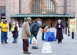 二零零八年一月五日,冬日的寒风没有阻挡住芬兰赫尔辛基的法轮功学员们,他们一如既往,趁周末人流量大时,又来到市中心的火车站旁揭露中共邪党迫害法轮功,特别是活摘法轮功学员器官,牟取暴利,焚尸灭迹的罪行。