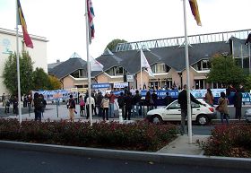 二零零八年十月八日下午,新唐人电视台及其支持者在法国卡昂市市欧洲卫星公司股东会议场外举行记者会,强烈要求欧卫恢复向中国大陆发送新唐人电视台的传播信号。