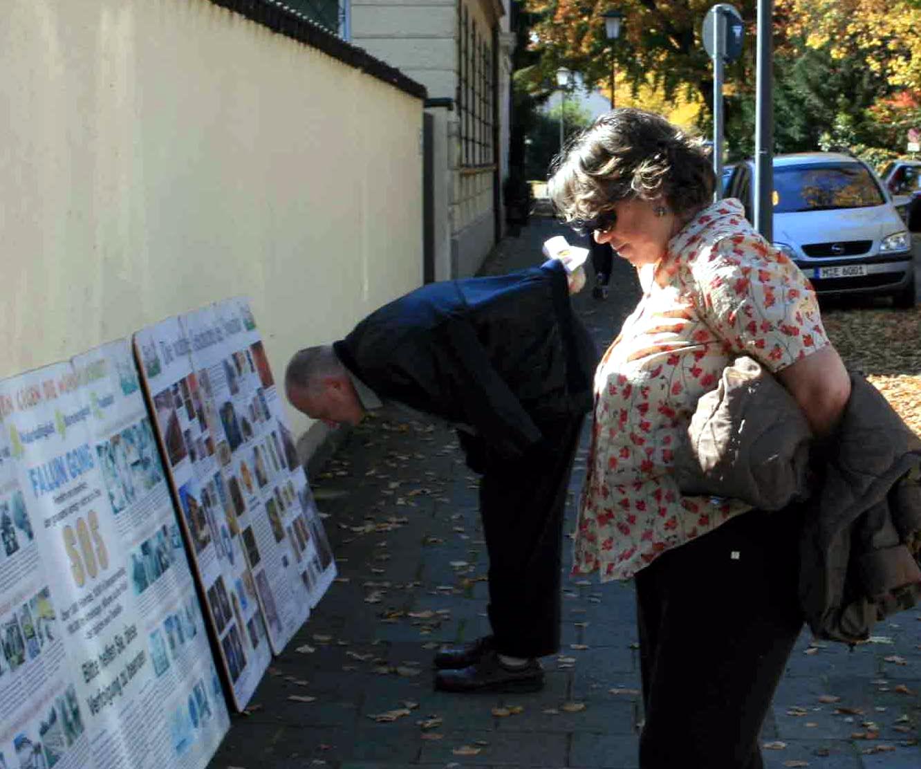 秋日的慕尼黑气候十分宜人,树叶都开始转为红黄色,在蓝天的映衬下非常美丽壮观,这样的好天气自然吸引大量游人。人们成群结队的来到著名景点纽芬堡王宫游玩。当他们路过附近的中领馆时,不少人都被法轮功学员祥和的炼功场景、横幅与图片展板所吸引。在仔细观看了揭露中共迫害的展板之后,一位老年妇女流下了眼泪,亦有人被炼功的音乐打动,其中不少人签名声援法轮功学员。