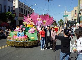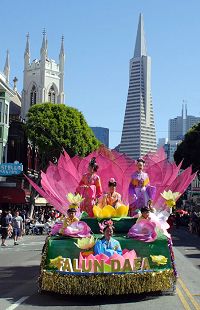 ![]() 法轮功学员的花车经过旧金山地标环美金字塔大楼 |