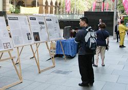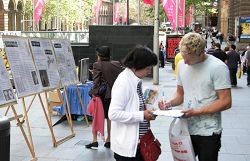 一位三十多岁的澳大利亚妇女,看完展板后签名制止中共迫害法轮功。学员林先生前去谢谢她的支持,她抬起头却答不出话来。原来她的眼中噙满了泪水,哽咽的说不出话来。她不停的擦拭着涌出的泪水。她很受触动,无法理解为什么在中国会发生这么残酷的迫害。