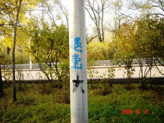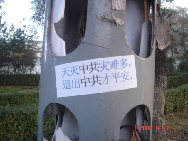 大陆北方某市出现大量退党标语,在公园的巨石上、在公园里的假山上、道路两边的电线杆上、围墙上、家属楼的墙上、大树上及体育广场的立柱上等地方出现喷漆和不干胶标语——喷漆喷出的标语有:“天灭中共 天佑中华”、“退党保命”、“声援四千三百万人退党”、“驱除中共恶党,还我中华”、“恶党不亡,国无宁日”、“法轮大法好”、“中共毒奶害死婴孩、豆腐渣工程害死灾区孩子、中共是万毒之源”、“平反法轮功,法办江泽民”等;不干胶上写着:“天灭中共灾难多,退出中共才平安”、“追查迫害法轮功的国际组织”公布天安门自焚案是一出重大的阴谋栽赃陷害!、“中国大陆公安国安迫害法轮功,恶报知多少?”、“中国三大冤案:文革、六四、迫害法轮功”、“老百姓觉醒了”及退党声明等。