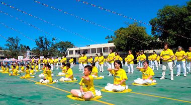 今年的校庆,特邀法轮功学员来学校表演。约一百三十位的学员演示功法,动作整齐划一,其中还不乏年纪小的学生,也包括黄主任的儿子及在北势国小任教的妻子。