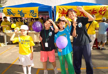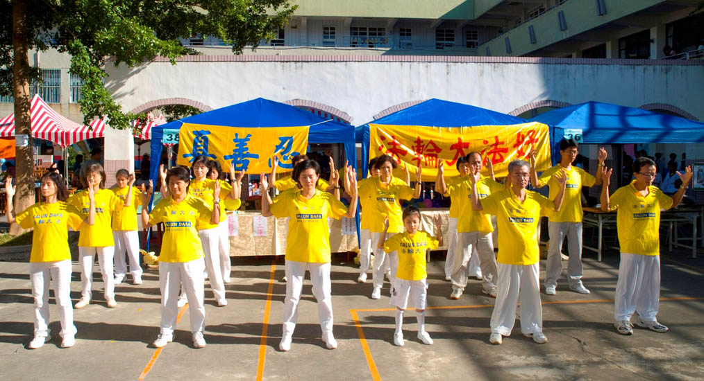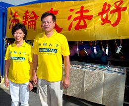 ![]() 法轮功学员在园游会摊位前展示功法 |