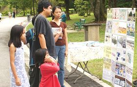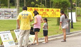 傍晚时分,很多吉隆坡人都喜欢到各个公园散步、慢跑,陪孩子玩乐。今天许多来到敦依斯迈尔公园的民众都被这群面带祥和的炼功人吸引,有的停下来看学员的炼功动作,有的看展板,有的接下学员递过来的真相资料。很多人都询问学员哪里有炼功点。