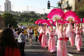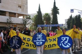虽然游行安排在下午,但上午公园里就聚集了成千上万的人,其中包括很多专门来以色列参加节日庆祝活动的外国游客。大法弟子们摆出了真相展板,集体炼功,希望有更多人能了解法轮功真相。人流不断的来到大法弟子旁边,人们在得知中共邪党迫害法轮功学员的事实后,纷纷在征签簿上签名,声援法轮功学员的反迫害行动。