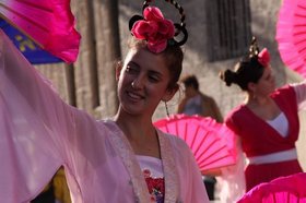 午饭过后,盛大的游行从甘萨克勒公园出发,其中法轮大法弟子的游行队伍格外惹人注目。身穿玫瑰色连衣裙、手持中国传统扇子的仙女队伍一出现,就把街道装点的多姿多彩,人们的眼光一下子就被吸引住了。走在仙女队伍后面的是横幅队,学员打着“法轮大法好”、“世界需要真善忍”、以及“法轮大法洪传世界八十个国家”等横幅;后面是腰鼓队,鼓声阵阵,人们对法轮功学员报以微笑。
