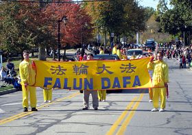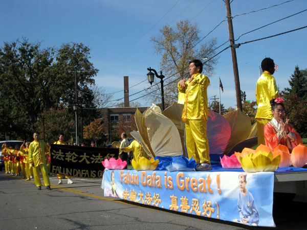 【明慧网二零零八年十月二十六日】二零零八年十月十九日,美国密西根州和俄亥俄州的法轮功学员参加了俄亥俄州萨尔伐尼亚市(Sylvania)金秋节游行。美丽的花车、优美的功法和精神抖擞的腰鼓队引来了街道两旁观众的阵阵掌声和惊叹。