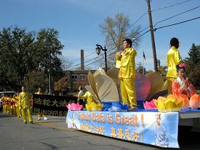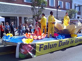 ![]() 各族裔法轮功学员在花车上表演五套功法 |