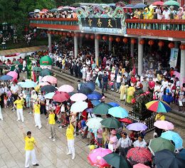 今年虽因台风将至,天空不作美,但仍有近二万名民众顶着风雨上山,在缓步移动中,五颜六色的伞将整个山区点缀的热闹非凡。为了让更多的民众了解法轮功的真相,法轮功学员不但准备摊位展出大法弟子证实法摄影展、播放真相影片及发放真相资料,同时也应邀进行功法演示。