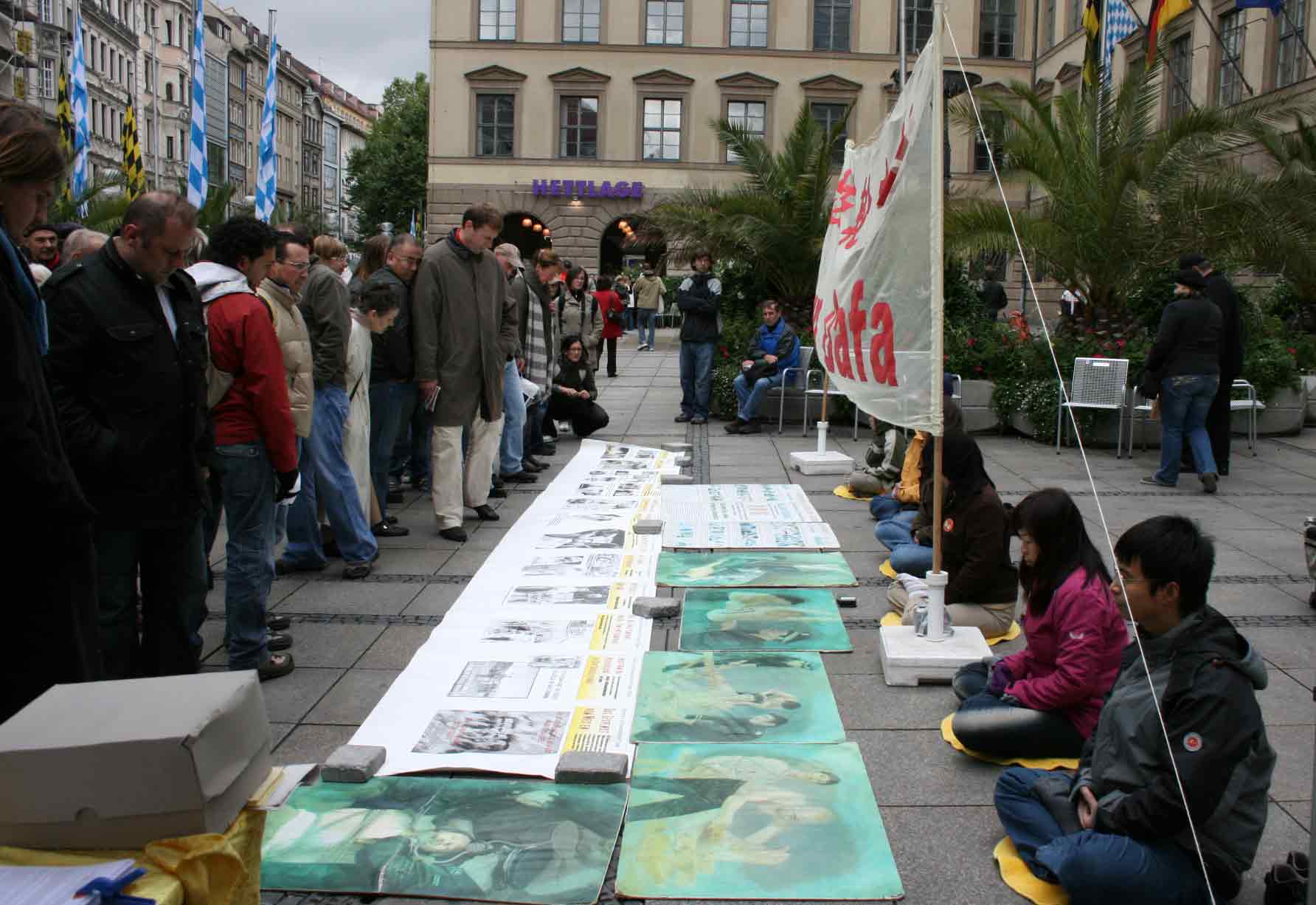 过往的中国人很多,他们中年纪大一些的人比较容易接受真相材料,但是一些很年轻的,由于他们从小就被中共的谎言毒害,因此比较难接受真相,但他们又很渴望了解真相,有些人站在远处观望、有些人不停的拍照。一位年轻的女孩对法轮功学员说,她的父母都来自中国大陆,她从小在德国生活,经常看报纸上刊登法轮功学员受中共迫害的事。她签名声援法轮功之后,最想了解的是法轮功到底是什么,为什么中共要迫害他们。学员告诉她,因为法轮功学员是以“真、善、忍”为准则来要求自己,这和中共的“假、恶、暴”就形成了鲜明的对比,而且修炼法轮功的人数增长很快因此中共对法轮功无法忍受,非要迫害法轮功。但持续九年的迫害,中共并没有达到目的,反而现在落得面临解体的下场。还有一个年轻的姑娘从远远站在一旁的几个中国伙伴身边走过来,主动索要法轮功的真相材料,并告诉学员她已经在网上做了退团声明了,她说:“我非常爱看这些材料,你们做的太好了。”