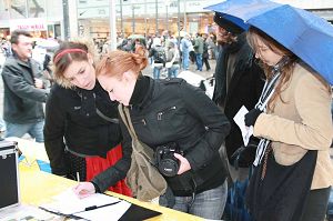 还有四位中文说得很流利的德国人、斯洛维尼亚和其他国家的人也来签名谴责中共,当记者惊诧于他们的中文表达的很清楚时,他们说学中文已经三年了,其中一年呆在中国。他们说在中国就了解到了法轮功受迫害的真相,因为那里有好多法轮功学员跟他们讲过真相,他们都知道法轮大法好。,因此他们要来签名声援法轮功学员。