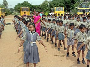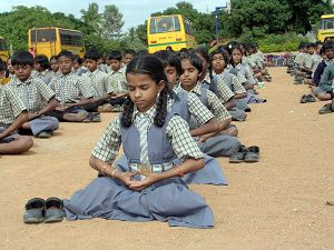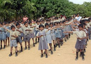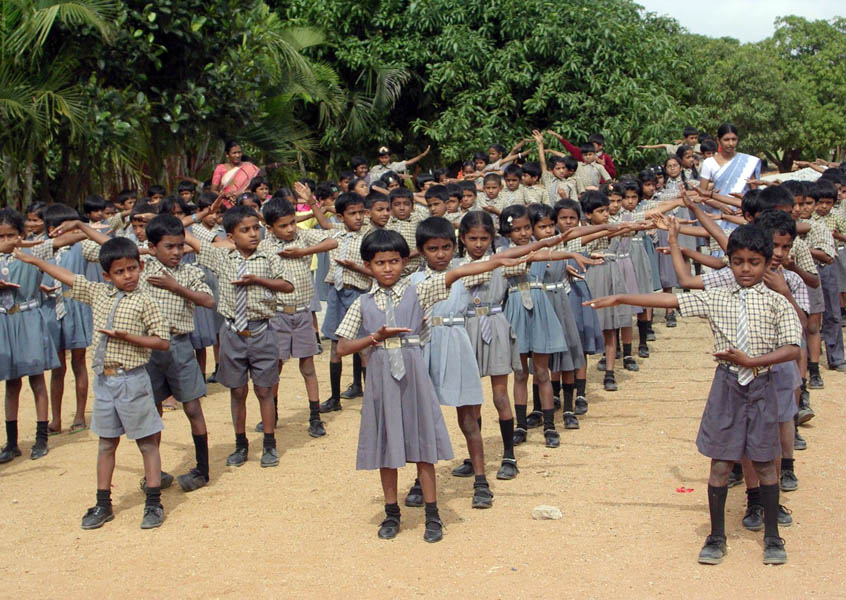 ![]() 校长及老师集体炼功(第一排穿白色衣服者是校长Mr. Sri Ram Reddy) |