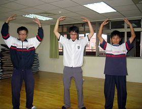 ![]() 煜明(中)和同学一起炼法轮功第二套功法 |