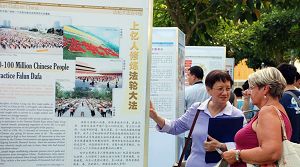 芳林演说角落毗邻地铁站的出口,靠近中国城,交通便利。不少路过的民众和游客被祥和的炼功场景吸引,纷纷前来看个究竟。有几位西方游客更是饶有兴致的举着相机拍照留念。一些来自中国的学生和客工在惊讶之中上前阅读展板上的文字说明,他们认真倾听法轮功学员们的解释,并取走了更多的资料。