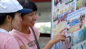 民众观看展板、了解真相