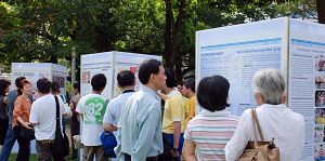 学员们在草地上展示了十几块图文并茂的立体展板,概述了法轮功洪传全球的概况、在新加坡的发展历程、各国政府对法轮功的褒奖以及中共迫害法轮功的残酷事实。在展板的另一侧,十几位学员列队演示法轮功五套功法。伴着柔和悦耳的炼功音乐,几名学员在展板旁边向观看的民众细心的补充介绍并且回答他们的提问。