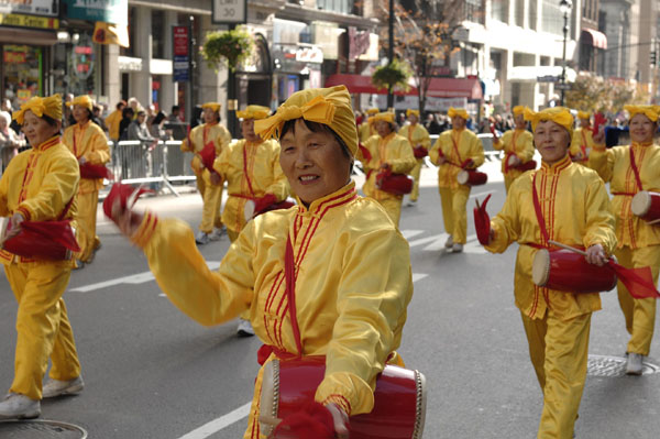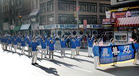 一位老夫人热切的问法轮功学员,什么时候轮到你们?学员告诉她:“我们将是最后一个队伍”。这位夫人马上肯定的回答:“我要等着看到你们游行。”
