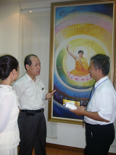 大同高中李庆宗校长很专心的听解说。他表示,法轮功是一个教化人心的团体,信仰的「真、善、忍」能提高人的道德。