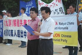 退党服务中心发言人吴先生(左)与张先生(右)在集会现场分别以马来文及中文,向现场民众郑重的宣读致全世界华人的忠告信。 |