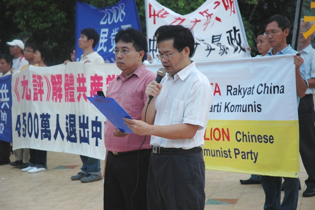 声援三退活动于下午五时开始。退党服务中心发言人吴先生与张先生在集会现场分别以马来文及中文,向现场民众郑重的宣读致全世界华人的忠告,呼吁大家别受恶党牵连,“三退”(退党、退团、退队)保平安。