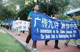 发言完毕,声援三退队伍从集会现场出发游行,吸引更多民众的关注。与此同时,退党服务中心义工也于现场散发资料与《九评》。