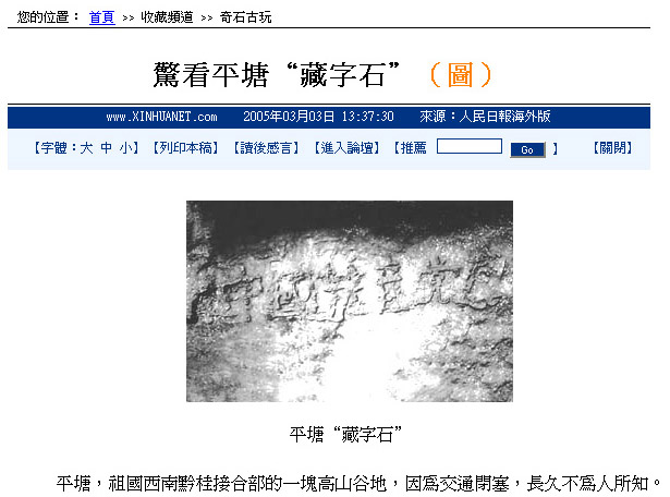 2002年6月都匀国际摄影博览会推荐贵州省平塘县掌布乡景区为摄影采风点,原任村支书王国富在清扫景区时无意中发现了这块“藏字石”,2003年8月中旬,平塘县邀请了贵州地质专家到掌布考察,2003年12月又邀请了中科院院士著名地质学家李廷栋、刘宝珺、中国地质大学教授李凤麟等15人对“藏字石”进行实地考察。专家一致认为“藏字石”上的字位于距今2.7亿年左右的二叠统栖霞组深灰色岩中,浑属天然,堪称世界级奇观。并人民日报、中央电视台、等100多家报纸、电视、网站作了报道。但报道只提“中国共产党”五个字而没有报最后一个“亡”字,但图片上是六个字。