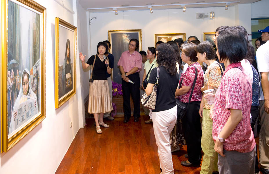 在东南科技大学任教的洪姓讲师,一个人静静欣赏每一幅画作,看完后他表示,看到今天的作品有别以往欣赏的画作,曾看过米勒作品那种田园写实,让他能唤起童年时光的记忆,然而今天欣赏到这些作品,深深触动到内心深处,他几度哽咽的说不出话来。他说:画中的人物与故事都是那么的真实,有几幅画是被迫害家庭的儿童,从他们的眼神让我感受到真实的情境,从那些儿童的眼神流露出对迫害的不解及悲伤,我马上深刻体会到那种氛围,极力推荐亲友及学生来观赏。