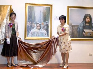 ![]() 明德国中校长葛虹(左)与张锦华教授一同揭开《礼物》这幅画作 |