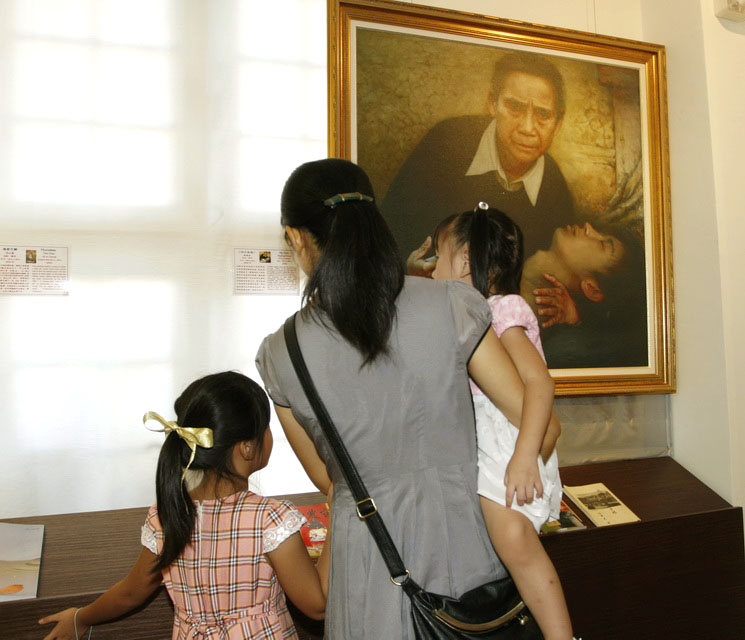 在士林区公所上班的蔡姓公务员,趁着周末假期,带着二个女儿来参观画展,母女三人静静欣赏每一幅作品,女儿有时向妈妈提问,蔡女士则看着画作旁的图解,耐心的讲解着画作里的故事让女儿了解。蔡女士眼眶泛着泪的表示,每一张画的背后都有着感人的故事,虽然迫害者施暴法轮功学员的一幕幕画面,让人感到黑暗面的压迫感,但看到法轮功学员身处那样的环境,精神面呈现出对「真、善、忍」信念的坚持,很了不起,因为那才是永恒的。