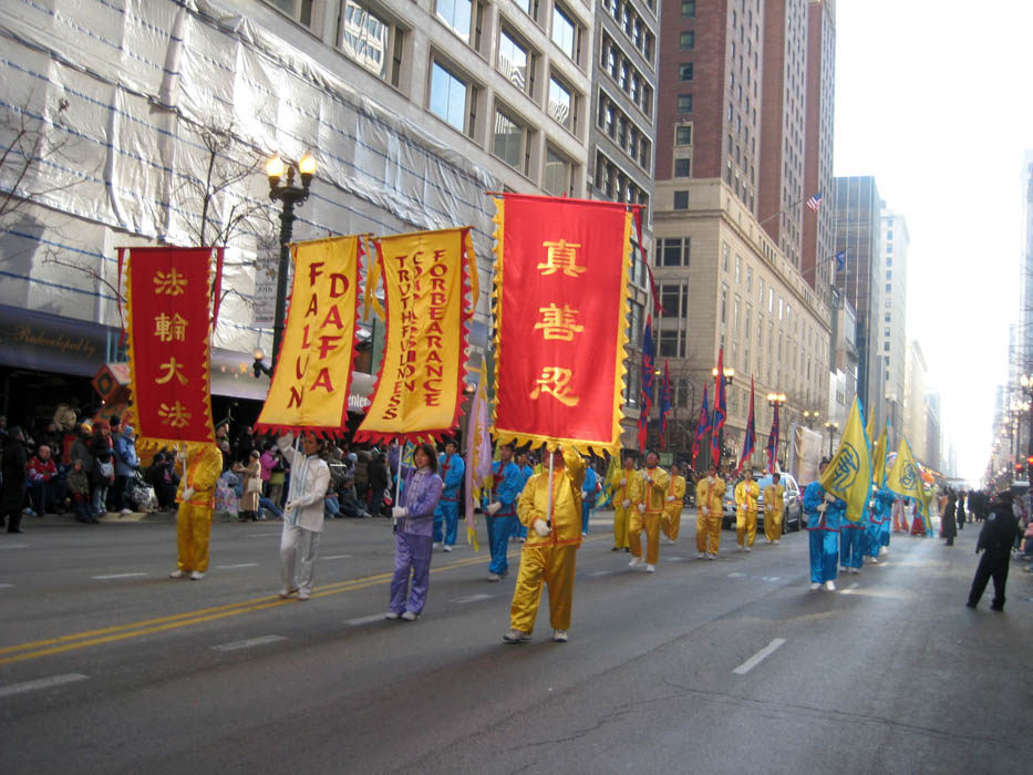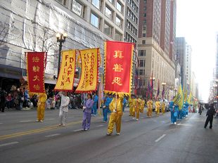 一年一度的芝加哥“麦当劳”感恩节游行是美中地区规模最盛大的游行,申请团体要经过组委会的严格筛选才能争取到亮相的机会。美中法轮大法学会自二零零三年首次参加芝加哥感恩节游行以来,年年都获邀加入表演。今年法轮功的游行队伍是以印有“法轮大法”、“真、善、忍”和“大唐”的旗队打头阵,由仙女和莲花点缀的神韵晚会宣传车紧随其后。