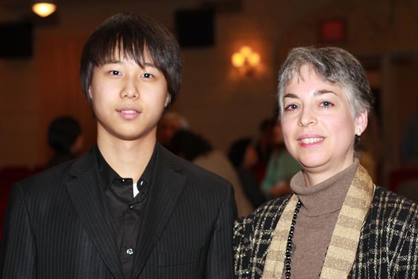 纽约朱丽亚音乐学院的钢琴教师怀特(Emily White)博士(右)与大赛金奖得主、朱丽亚音乐学院学生林易(左)合影