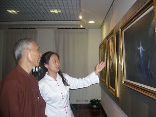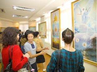高先生很喜欢画作《学法》流露出的平和,他说,人世间应该像这样祥和,并且询问导览人员:“像我工作这么忙碌也能修炼吗?”导览人员回答他:“当然能,法轮功很适合现代人学炼,学员都是来自全世界八十多个国家和地区的各行各业。”