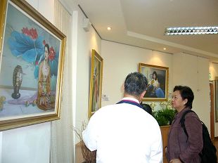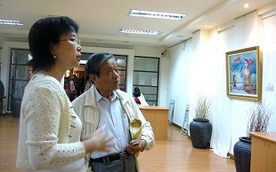 舞蹈学会理事长赖秀峰(穿红外套)仔细的听解说,她喜欢张昆仑的《佛像》、陈肖平的《天人合一》。