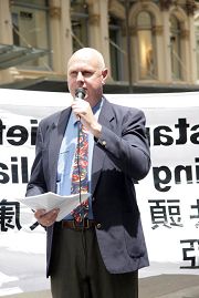 二零零八年十一月三日中午,悉尼法轮功学员在市中心马丁广场举行新闻发布会,向澳洲社会和司法部呼吁拒绝迫害法轮功的元凶之一周永康入境。