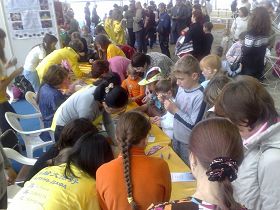 俄罗斯儿童体育王国博览会是集儿童游戏、文化娱乐、体育运动和军事体育等为一体的大型综合儿童盛会。展会期间,来自莫斯科和其它城市的小朋友在父母和长辈的带领下,每天上午十点之前就早早的等在展馆门口。展馆区内人头涌动,热闹非凡。俄罗斯法轮功学员借此机会向人们介绍以“真善忍”为原则的法轮大法,深受人们欢迎。仅十一月一、二日两天时间,就派发出去各种真相资料近一万份,现场教做和散发纸莲花上千个。