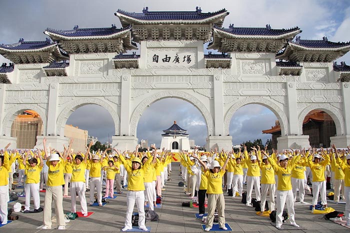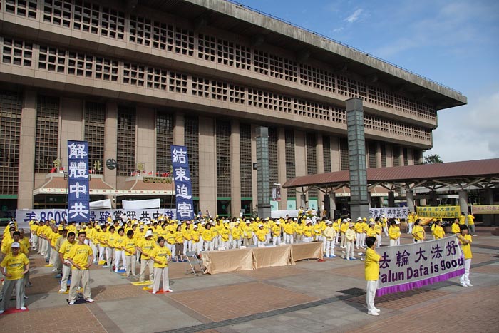 近三千名法轮功学员在台北自由广场前炼功,呼吁来访的中共党员把握千载难逢的机会,「退党保平安」。
