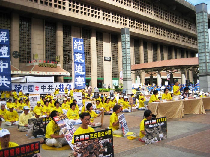 台湾法轮功学员在台北火车站以标语横幅,以一贯的和平方式表达诉求。